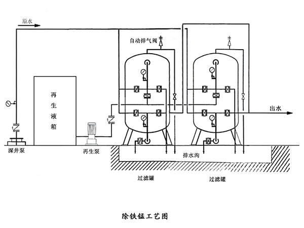 除铁锰过滤器由曝气装置和锰砂过滤罐组成;利用氧化法将水中低价铁离子和低价锰离子氧化成高价铁离子和高价锰离子,再经过吸咐过滤去除,降低水中铁锰含量。